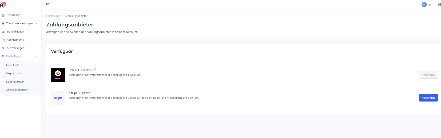 Sobald Sie Stripe ausgewählt haben, wird "Anbietereinstellungen" angezeigt.