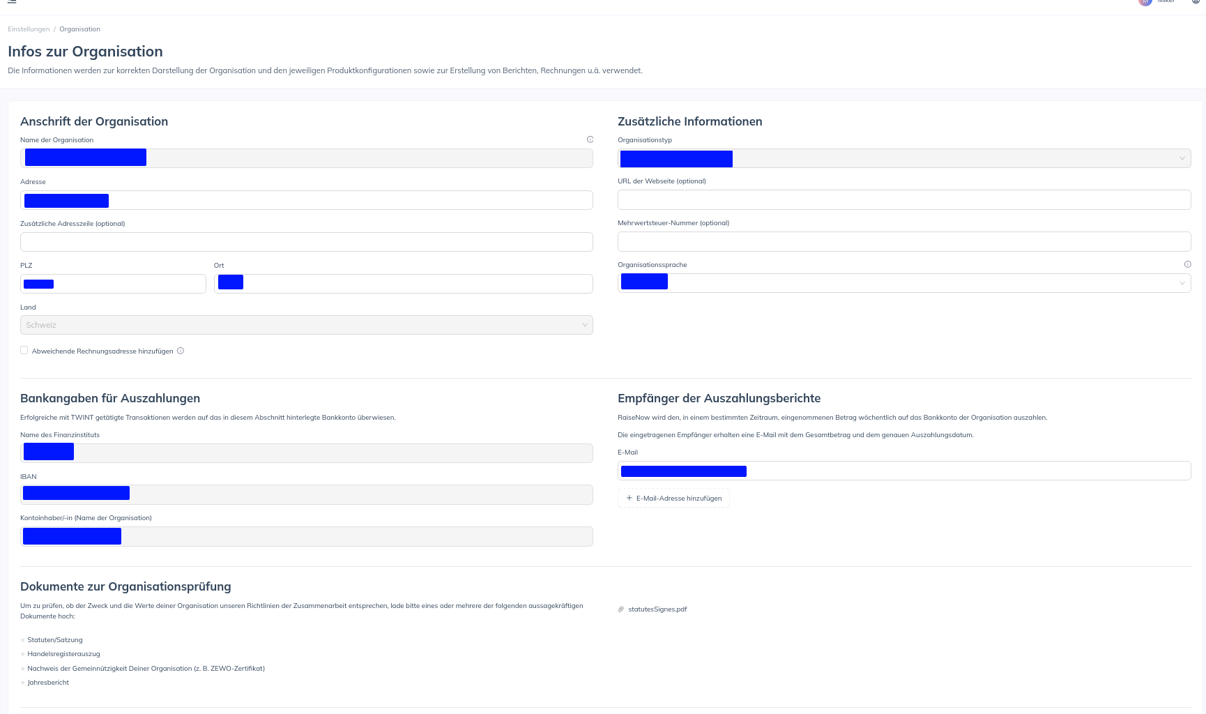 * Füllen Sie die wichtigsten Informationen über Ihre Organisation aus.