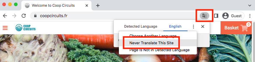 Si la page est en français mais que vous voyez l'interface en anglais, c'est probablement que votre navigateur traduit la page en anglais. Par exemple, si vous utilisez Google Chrome, si la page est traduite automatiquement vous verrez une icone de traduction à droite de la barre d'adresse. Pour désactiver la traduction automatique de la page, cliquez sur cette icone et choisissez "Ne jamais traduire ce site", comme ci-dessous :&#x20;
