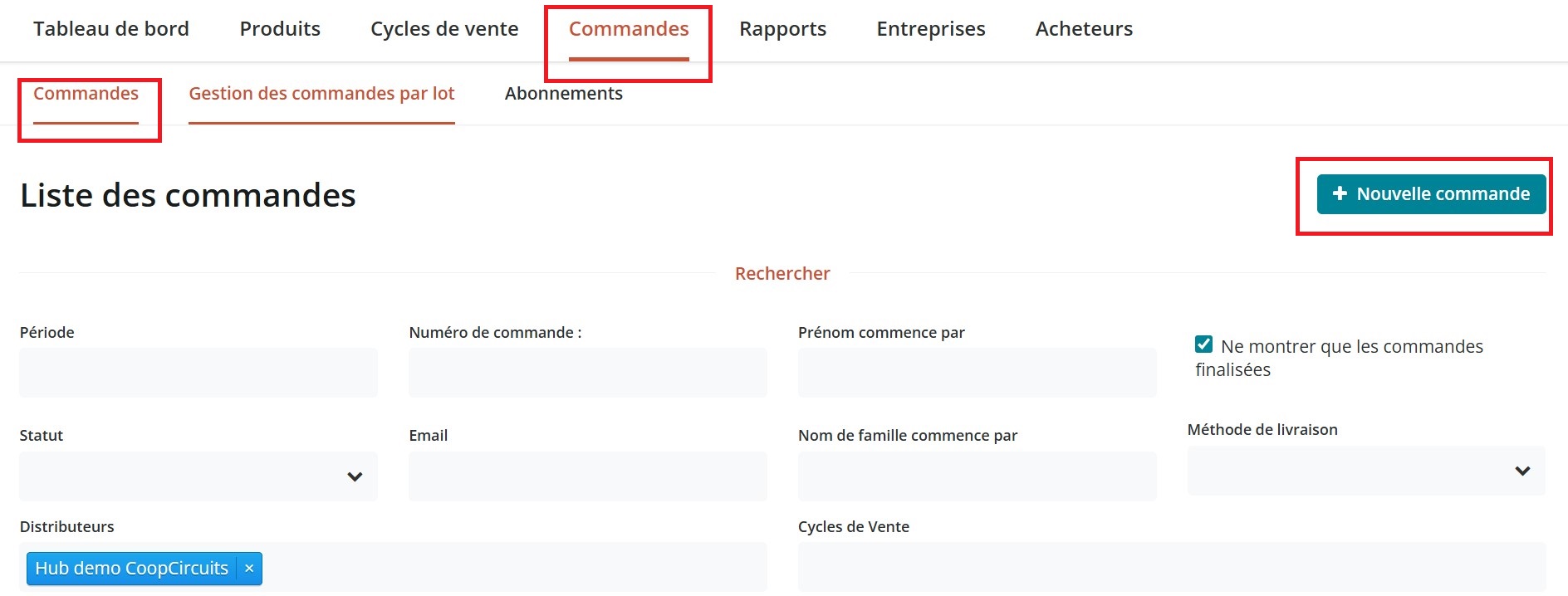 Parfois, vous souhaitez passer vous même une commande manuellement dans le système, pour le compte d'un acheteur ou pour que vos rapports incluent une commande issue d'une autre plateforme par exemple. Rendez-vous sur **Commandes** et cliquez sur le bouton **Nouvelle Commande** : \ <br>