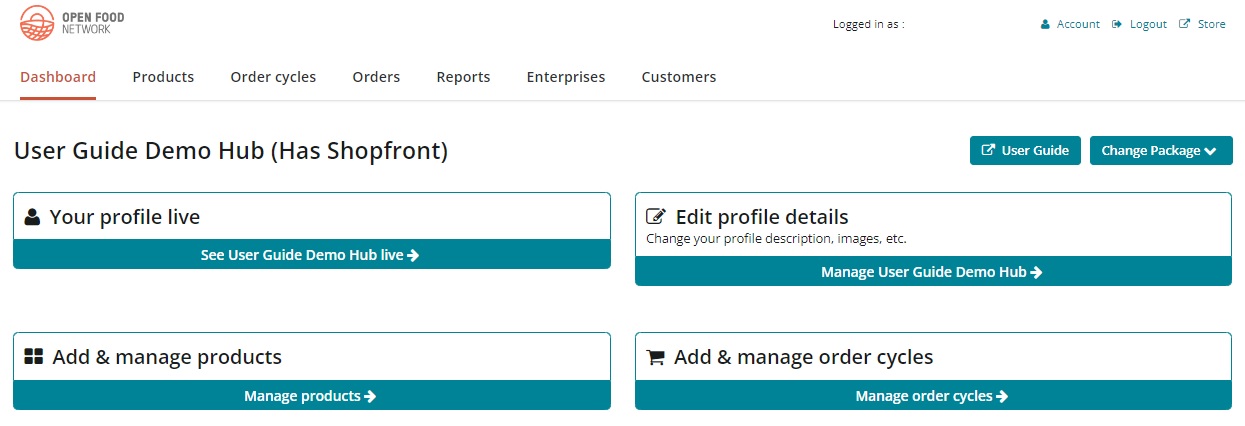 The Dashboard is where you can edit and manage your enterprise's features & settings on the Open Food Network platform. If you have chosen to register your enterprise as a shop or hub then you can also edit your products and order cycles from the Dashboard.