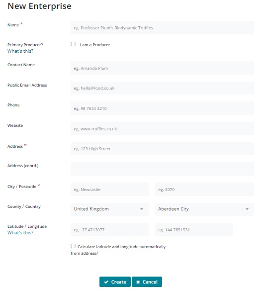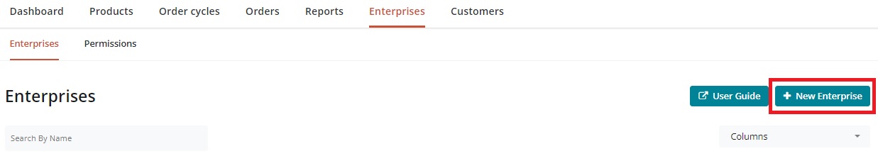 You can create a new profile for a producer by clicking on Enterprises main horizonal menu, and then clicking + New Enterprise. Remember ‘enterprise’ is a general term used for any producer or hub profile on the OFN.