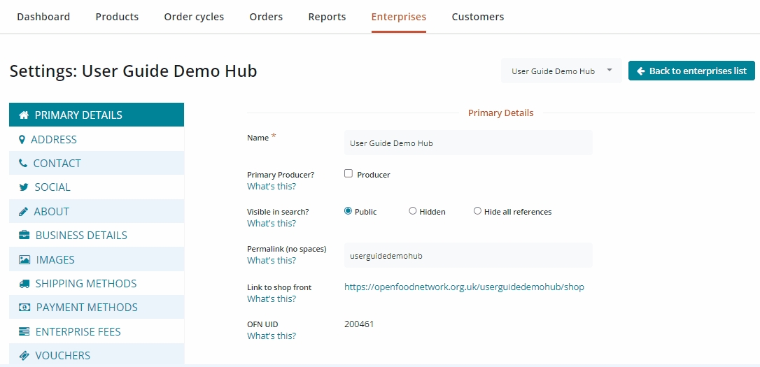 Visible in Search: If your profile is ready to go public, select 'public', and your business will appear in the OFN's directory and map. Selecting 'hidden' will hide your profile in search and maps but still allow references in other shop profiles. 'Hide all references' will make your enteprise completely hidden on the platform. This will mean that only people with a direct URL to your shopfront (e.g. https://openfoodnetwork.org.uk/your-shop/shop) will be able to find your shopfront.