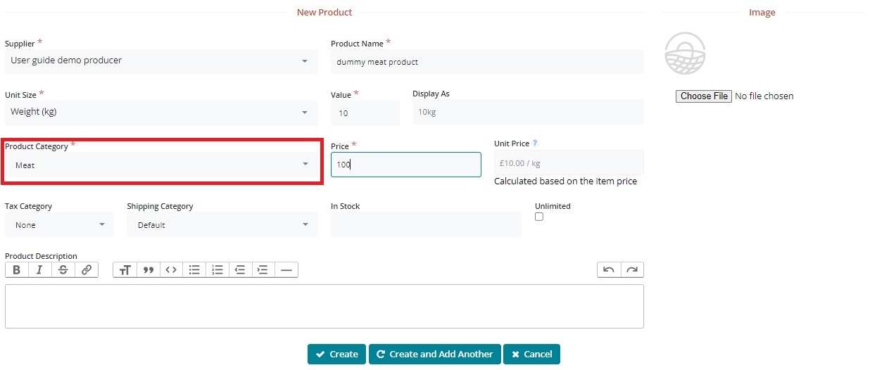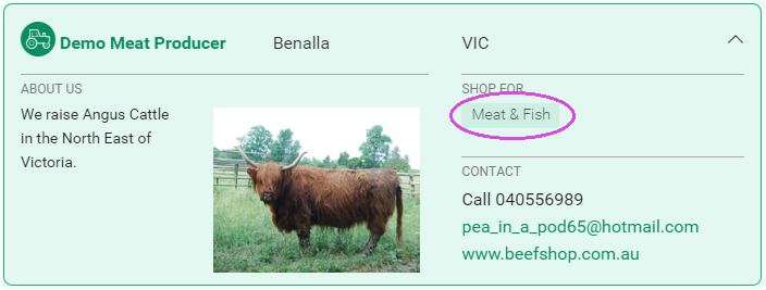 Because you don’t have an OFN shopfront, this product won’t be visible anywhere. Therefore you can call it whatever you like, and set the price and units to anything. The important thing is that you select the correct Product Category that you wish to be found under. Below is an example of a dummy meat product. This producer’s profile will now show if a customer searches for producers of meat.