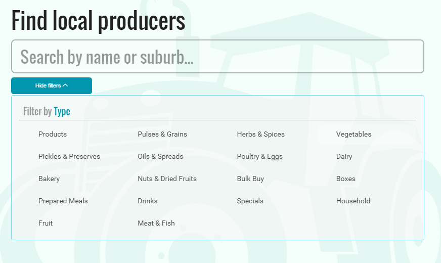 When customers come to the Open Food Network they are able to search for producers by name or location. They are also able to filter the producer profiles according to what kinds of products the producers stock (see below).