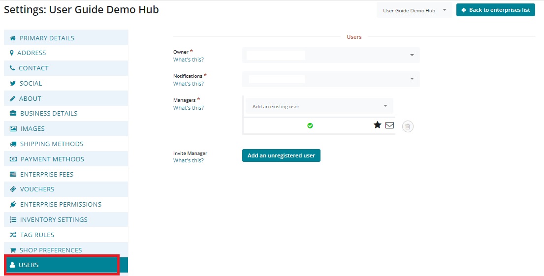 Once the producer is a manager of the enterprise profile you created on their behalf, you can choose to name them the main manager and/or the contact to receive order notification. At this stage, as a hub manager you may wish to remove yourself from the list of managers.