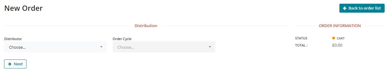 Firstly you will be prompted to select the distributor that the order will be placed with. Next you will need to select the order cycle that you want the order to be placed in. Your choice of order cycle will dictate which products will be available to be added into the order and the fees applied. Click next once you've completed these fields.
