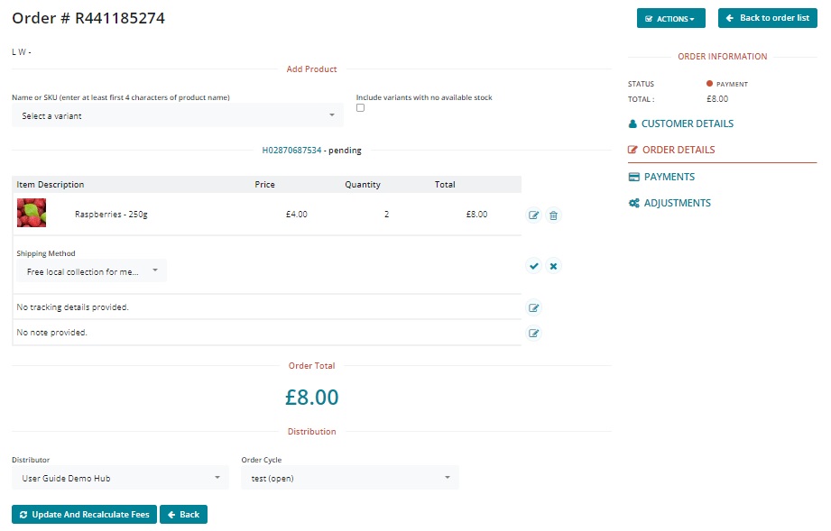 One of the available shipping methods which the distributing enterprise offers will be selected for the order by default. You can edit this, along with add tracking details or a note in the same manner as for editing an existing order.