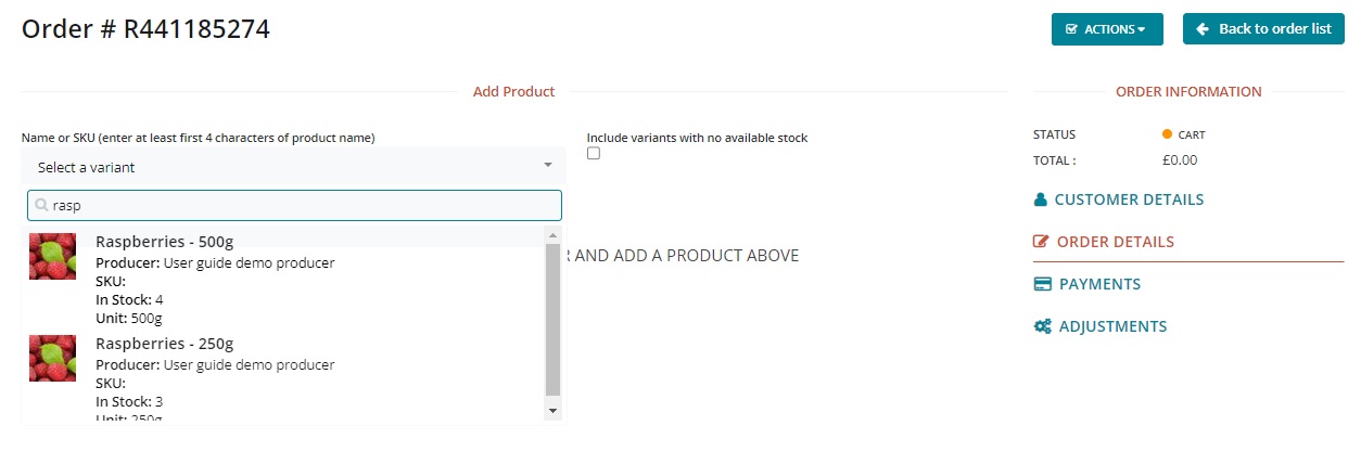 You will then be redirected to the Order Details page where you can select products. You must type at least the first 3 characters of the product for it to appear as an option in the drop down list: