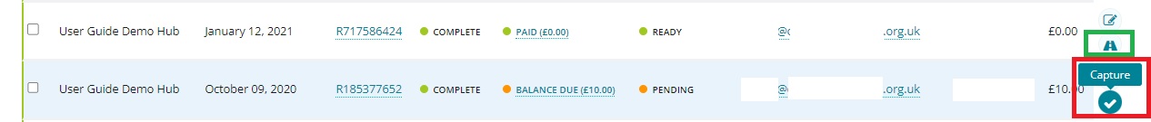 Capturing a payment will mark it as received. This is helpful if customers do not pay when they order. When you receive cash or a bank transfer from the customer, you can then go in to the Order Listing and capture the payment. To quickly capture a payment as received, or mark that an order has been shipped, you can click on the tick or road icons to the right of the order in the Order List.
