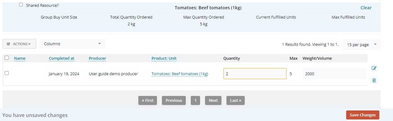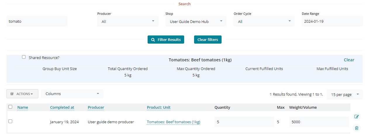 Search for ‘tomatoes’. All orders for tomatoes within the date range/order cycle you selected will now display.