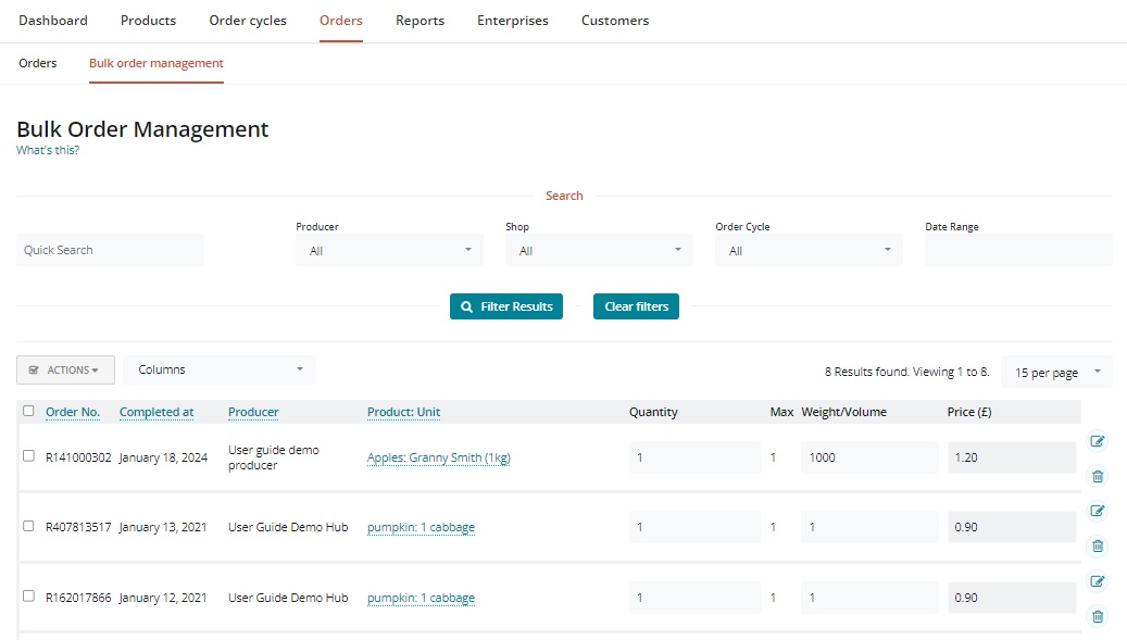 When selling indivisible products such as legs of lamb, or whole pumpkins, you may not know the final weight and price of the product until after the customer has placed their order. (Read more here.) You can use Bulk Order Management to update the item’s exact weight once you have the product in front of you.