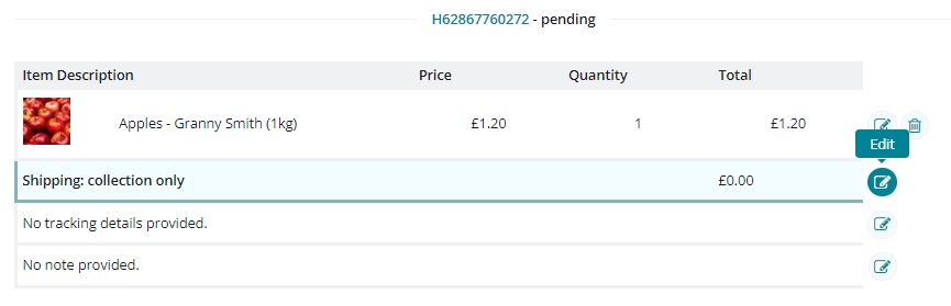 A customer may contact you and ask to have their groceries delivered rather than collect. You can edit the shipping method assigned to the order by selecting the edit symbol to the right of the shipping method: