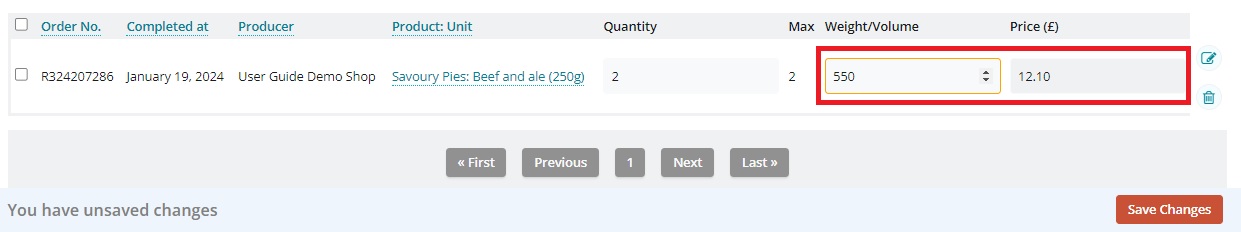 Enter the actual weight of the pies that each customer will receive in the weight/volume column. The price will automatically recalculate based on this weight.