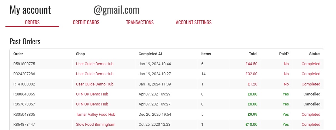 Your customers can view a list of their orders when they login to the OFN, and click on their account (see below).