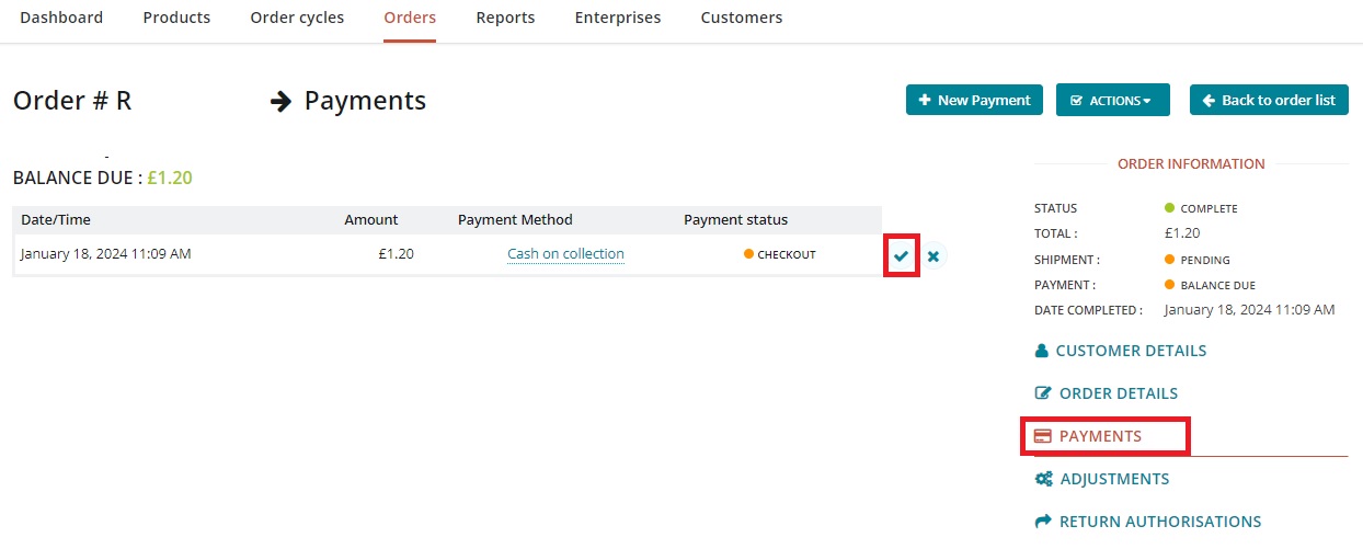 Note that this will capture the full amount of the order as paid. if you want to review the order details before capturing a payment, you can select the edit icon to the right of the Order you wish to review. In the Order Details screen, click on Payments to see the Balance owing and Payment Status for this order. From here you can click on the tick to capture the payment. Once captured, the Payment Status will change to Completed.