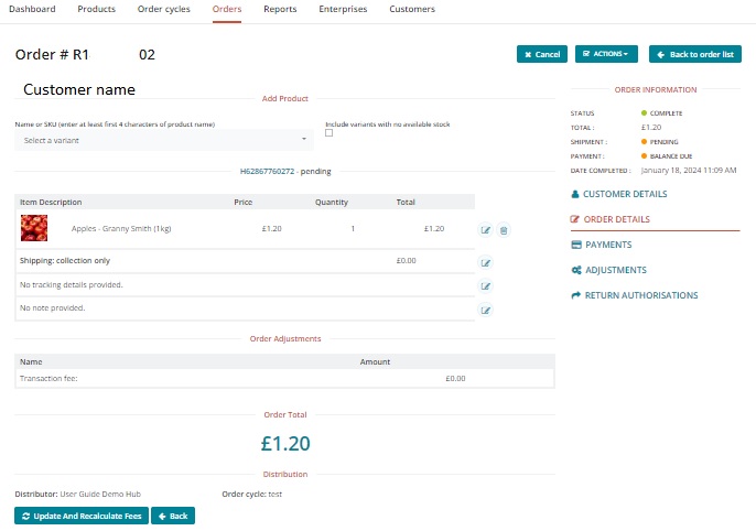 You can add a product to the order by selecting the variant you require from a drop down list of those available (at least 3 letters must be typed in to the field box 'Select Variant' for list of options to appear). To remove a product from an order click the rubbish bin icon on the right hand side of the product. You can also change the quantity of each item ordered. Remember to click the update and recalculate fees button to save changes (this will also update enterprise, shipping and payment method fees accordingly, where appropriate).