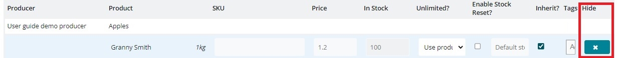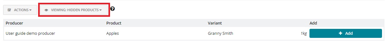 As in the New Products list, you can also hide products from your Inventory List. Clicking on the hide button will move the product to your Hidden Products list. If you have your inventory profile set up as 'New products must be added to my inventory before they can be added to my shopfront' (see here) then the product you just hid will no longer be available for selection in your hub's order cycle and thus will not be visible on your shopfront.