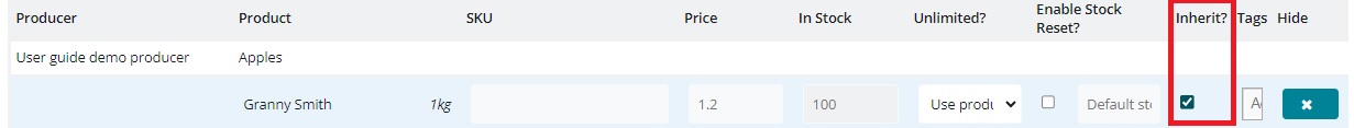 If you have not changed any of the values in the Inventory table for a product, the check box "inherit?" will be, by default, checked. This means that the information entered by the producer and visible in grey will be displayed on your shopfront.