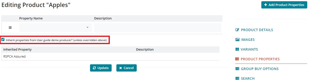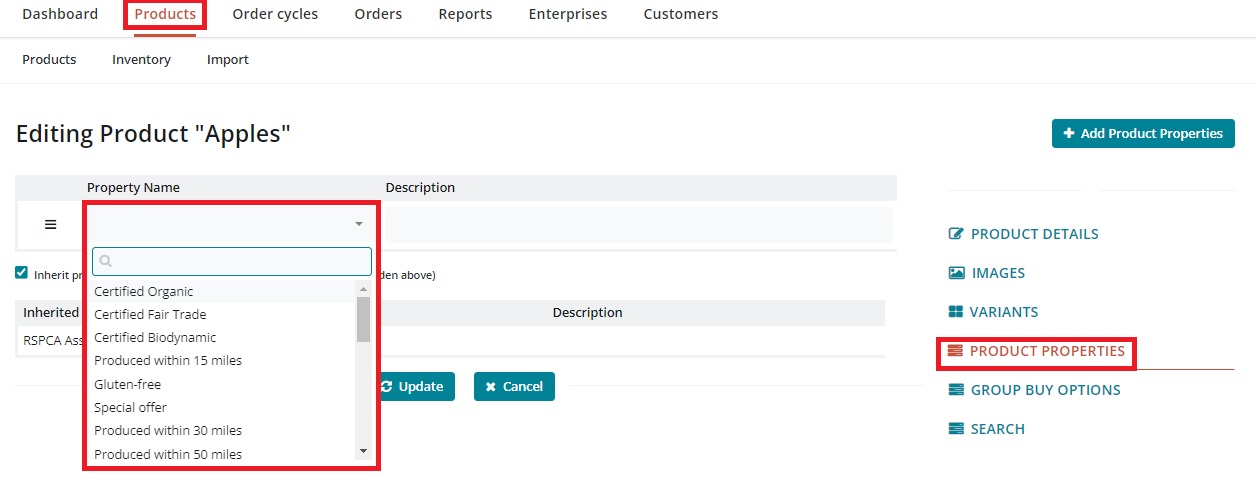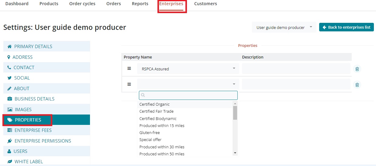 When you assign a property to an enterprise, all products belonging to that enterprise will, by default, carry that product property. For instance, if all of your products are ‘Certified Organic’, you can assign this property to your enterprise, to save you from needing to manually apply this property to every product. If a property only applies to a few of your products, it’s better to apply it to the product, instead of the enterprise (instructions below).