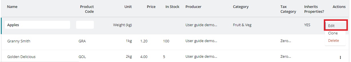To edit a product, click on 'Edit' under 'Actions' in the right hand column.