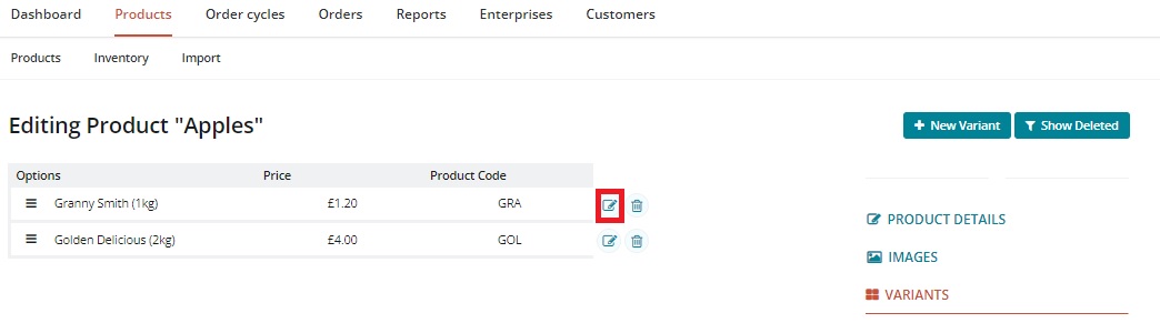 To edit other properties of a variant (such as its weight), choose 'Edit' from the 'Actions' column of the associated product and then visit the 'Variants' page from the right hand menu.