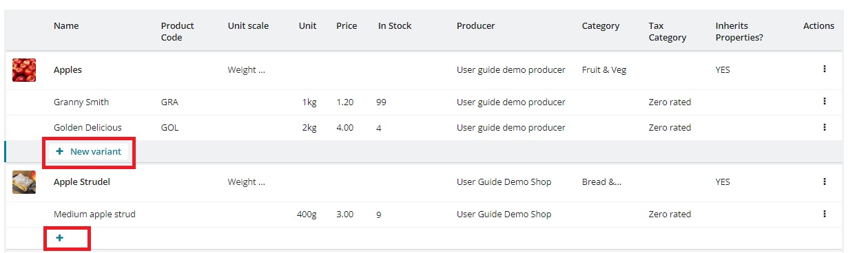 To add or delete variants, the simplest way is to click on the '**+**' sign at the bottom of the product row in question.