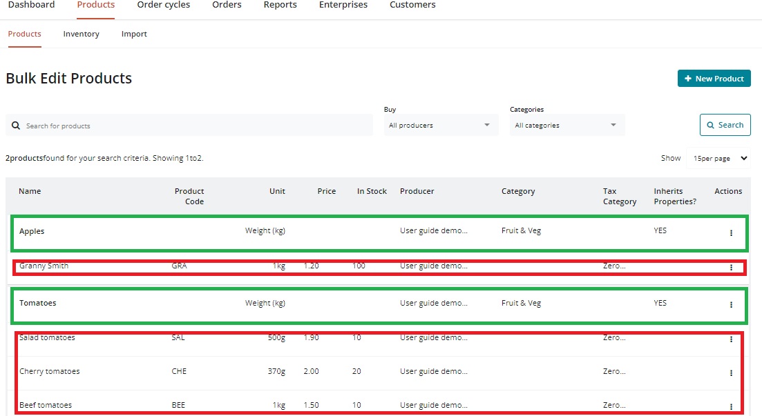 In your admin dashboard, go to the products page where you will find the list of products (highlighted in green below) and their associated variants (highlighted in red below) for companies of "producer" nature that you manage.