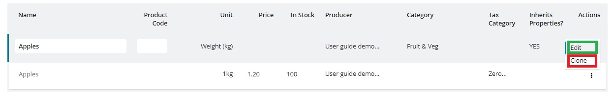 To edit or replicate a product, simply click on the three vertical dots in the 'Actions' column for the product row in question. The two options: Edit (highlighted in green below) and Clone (highlighted in red below) become available.