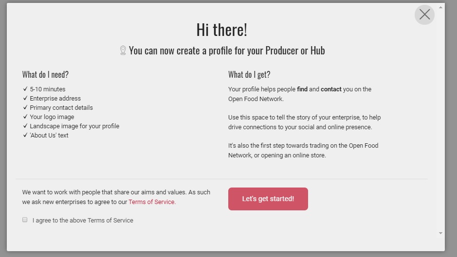 Click the ‘I agree to the above Terms of Service’ box and select ‘Let’s get started!’