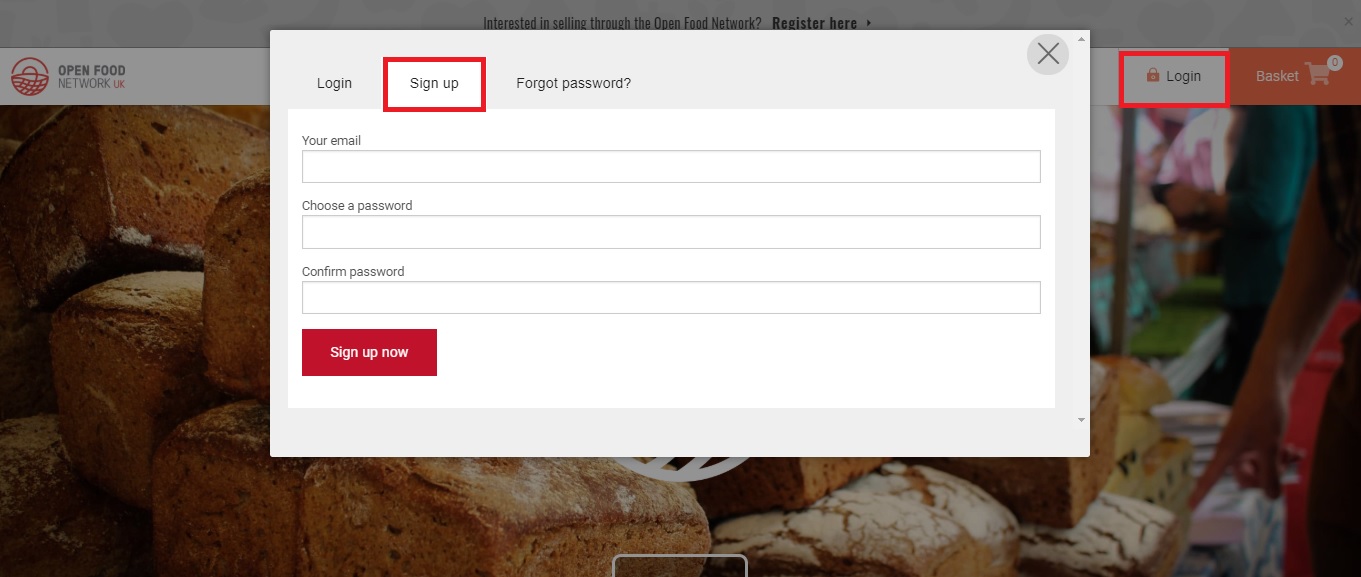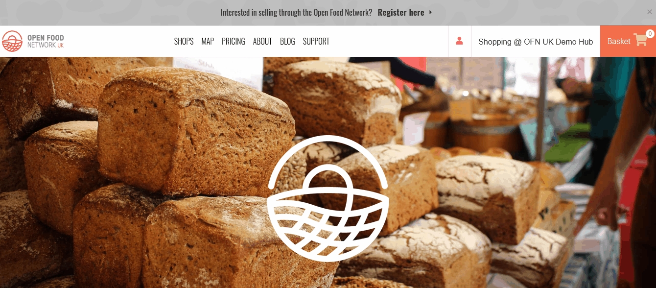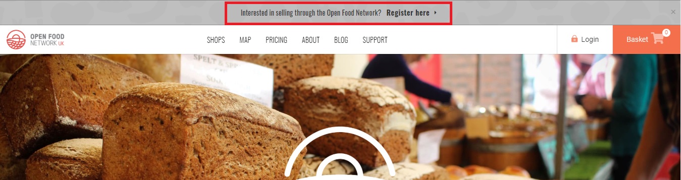Once logged in, click on the top grey banner "Interested in selling through the Open Food Network? Register here".