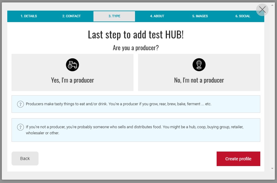 Choose between 'Producer' (you make/bake/grow products yourself) or 'Non Producer' (you distribute and sell food made by others).