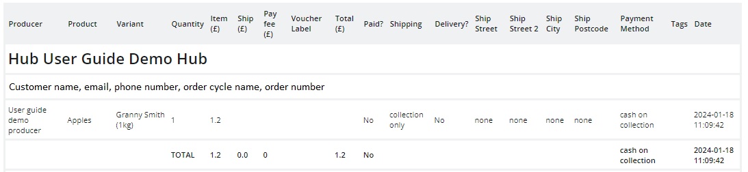 The screenshot below shows the information contained in an Order Cycle Customer Totals report.