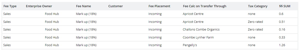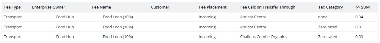 **Example 2**: a Hub charges a transport fee which they pay to a Producer for picking up produce from other farmers and bringing it into the Hub. This fee is calculated as a percentage on every product in the order cycle. They can use the Enterprise Fee Summary report to calculate how much to pay that Producer for transport in each Order Cycle.
