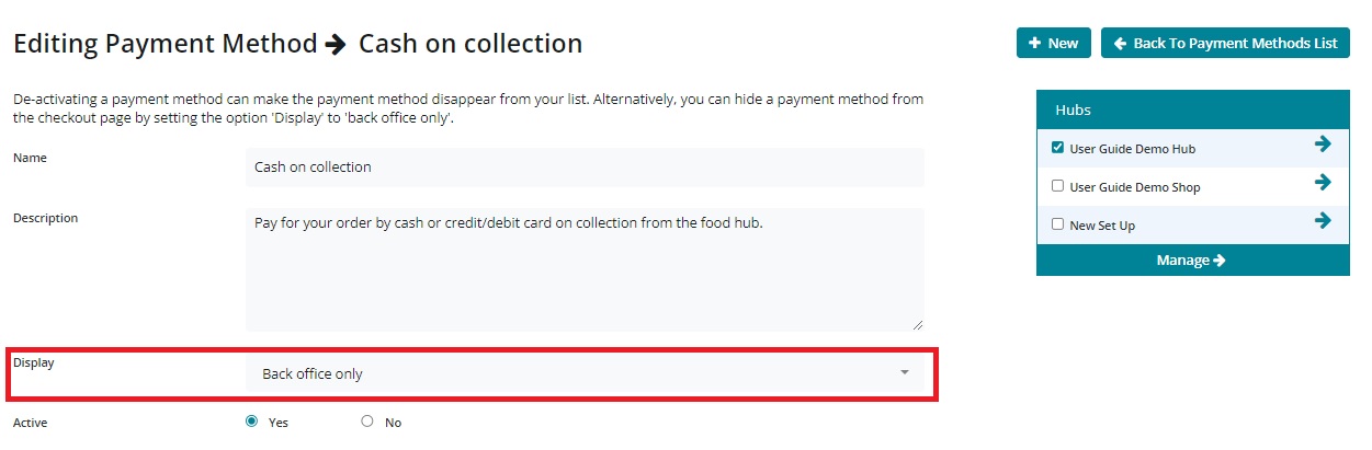 When you next open a live order cycle from which you wish to sell produce, you will need to change the Display state of at least one payment method to 'Checkout and Back Office' or 'Checkout only'.