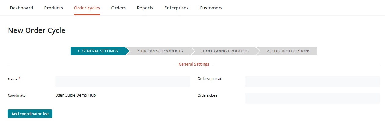 Once the order cycle coordinator has been chosen, the process of setting up your cycle can be broken down into four steps: