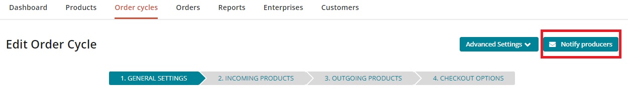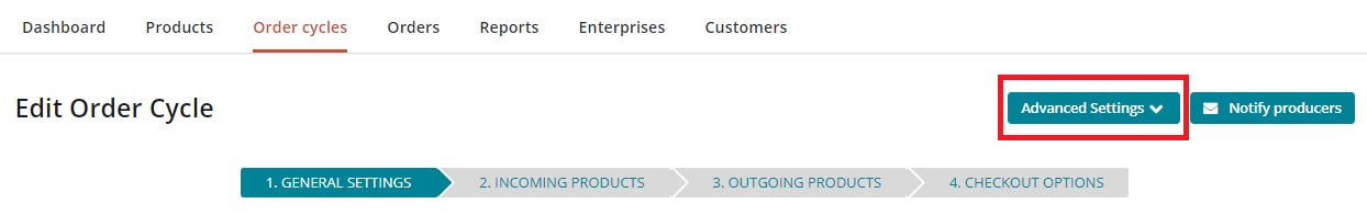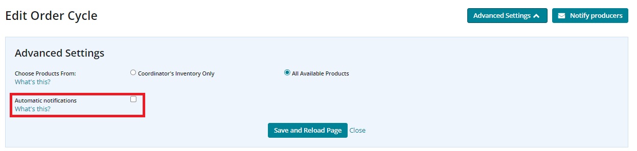 If you would like the producer emails to be automatically sent when an order cycle closes, you can do this from the 'Advanced settings' menu in the edit order cycle screen: