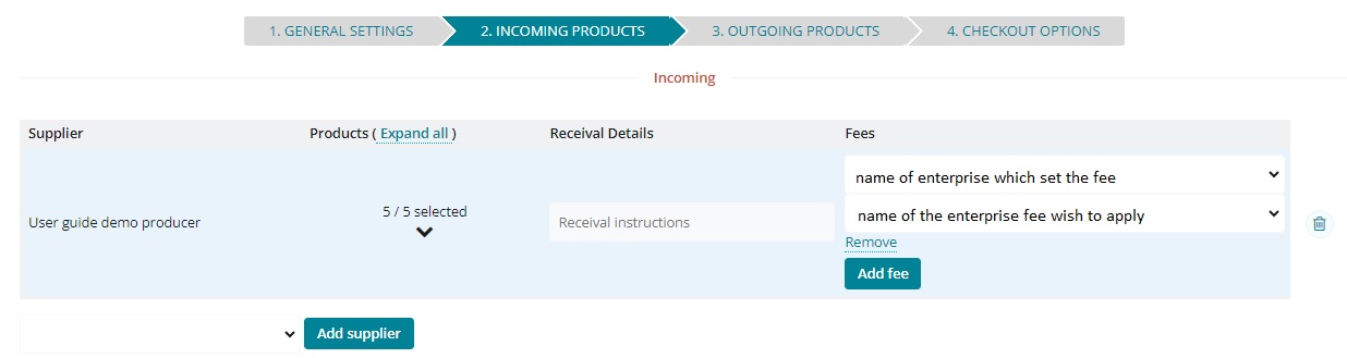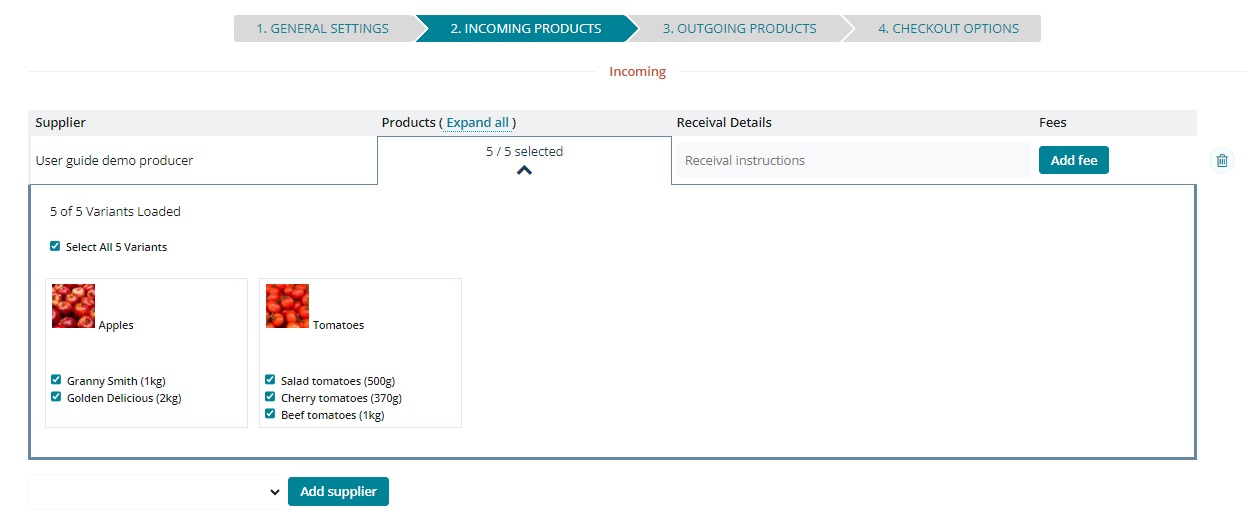 On this page you can select the producers, and their produce, which will be available in this order cycle. In the dropdown menu you will see all producers who have granted you permission to add their produce to your order cycle (See Enterprise Permissions section). After selecting a supplier and clicking Add Supplier, all of the products associated with that supplier will be visible. Check those products you wish to add to the store, or click select all.
