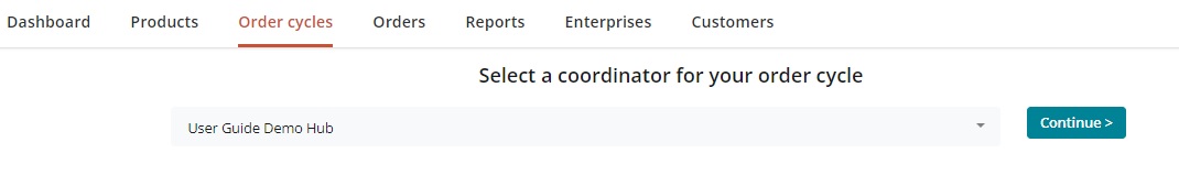 The first step is to select a coordinator for your order cycle. Only the enterprise who coordinates an order cycle has permission to modify and manage all aspects of the order cycle. Other enterprises involved in an order cycle (as suppliers or distributors only) will have restricted access. For more information on cross-enterprise management in the context of order cycles, click here.