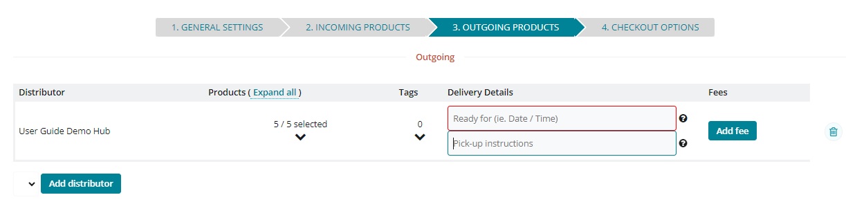 Here you can select one or more hub-distributors. All hubs chosen to be a distributor in this order cycle will have an open shop front for the duration of the order cycle. In a simple model, only one hub is listed as the sole distributor for the order cycle. Select the hub, and check the box 'Select all' to add all incoming products to the shop front. For more flexibility, the same order cycle may have multiple hub distributors. In this case you may wish to select a different subset of the available incoming products for each distributor, and/or add different delivery dates for each.