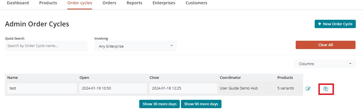 For periodic, repetitive order cycles, you can copy an existing order cycle and change the dates, to make the process quicker. Select the icon with two sheets of paper to the right of the table as highlighted below: