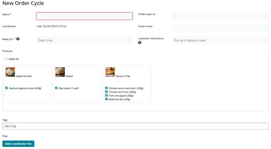 Name (required): Choose a name for this order cycle. This will only be visible to you, so it can be named anything which is meaningful for you. We recommend that you follow a consistent naming protocol e.g FoodHub_Week27_2014.