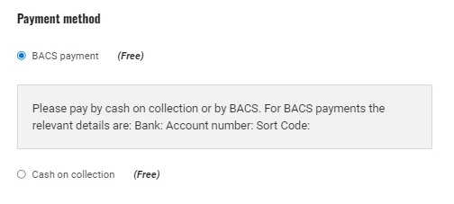 Description: provide further details about the payment method. For example, for a bank transfer, you would enter the bank account details in this box into which you would like a customer to make the BACS payment. This description is displayed at checkout and in order confirmation emails.
