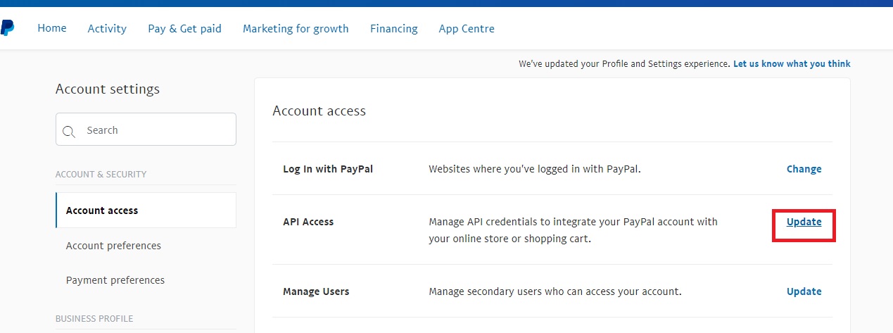 To setup a PayPal payment method, you need a PayPal business or merchant account. You can create one here. Once you have that, you can set up ‘API access’ within PayPal, which will enable OFN to connect customers directly with your PayPal account.