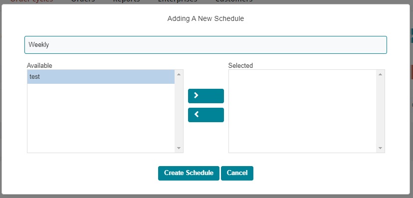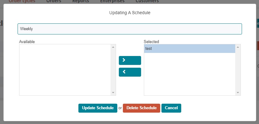 You can add existing order cycles into and out of the new schedule by clicking the < and > buttons.