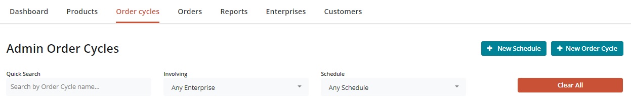 Having completed all the steps outlined above, the +New Schedule button will appear at the top of your Order Cycles menu: