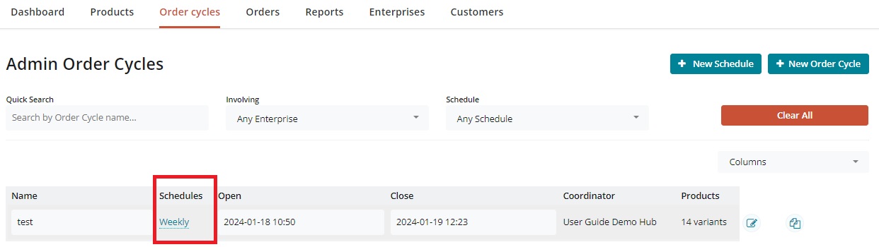 To edit or delete a schedule, click on the schedule’s name next to a corresponding order cycle, in the ‘schedules’ column. (The 'Schedules' column may need to be made visible by ticking it in the drop-down columns menu at the top right.)