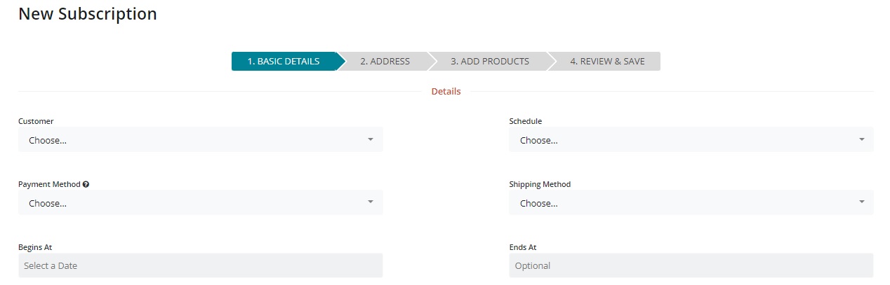 Begins at: This is the date that the customer’s first subscription generated order will be generated.
