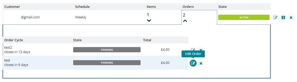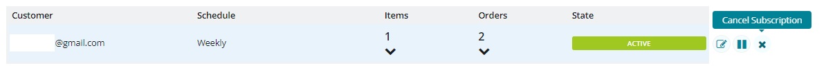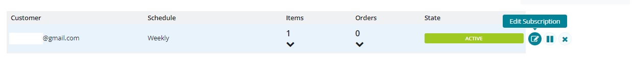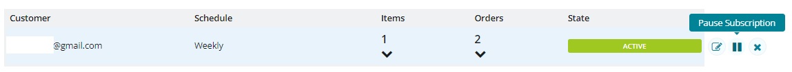 A customer may want to pause their order while on holiday for instance. In this case, click on the pause button (two vertical lines) to the right hand side of the subscriptions table. This will prevent all future orders in the subscription from being generated, until it is activated again.