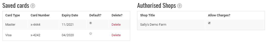 If your customer saves credit cards in their account, they'll also be able to quickly select these when they shop in your shop at checkout.